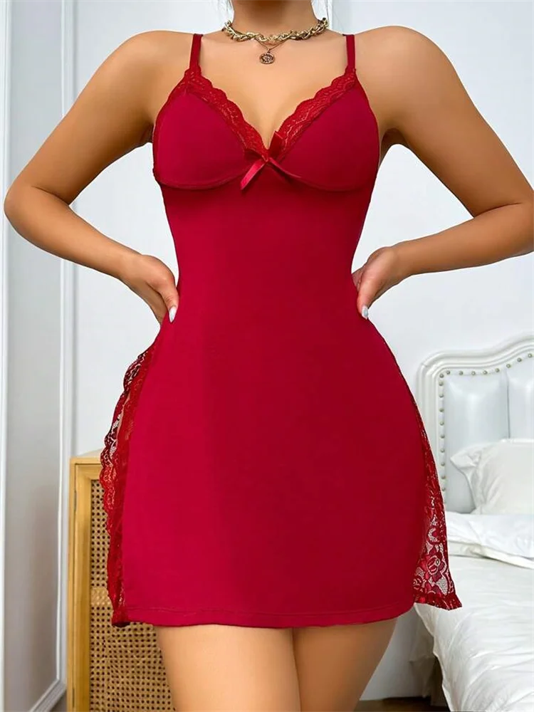 Indulge in this V-neck mini slip nightdress—soft lace, sheer mesh, and a seductive silhouette for romantic evenings and comfortable nights.